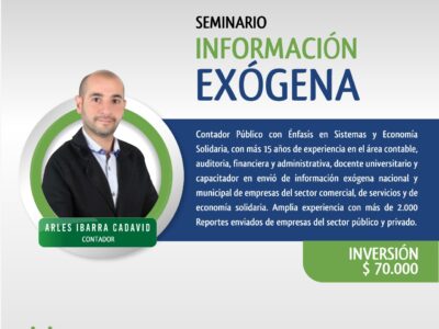 Seminario de información exógena Conferencista: Arles Ibarra Cadavid Inversión: $ 70.000 Fecha: 24 de febrero del 2022 Temario: Sujetos obligados a suministrar información exógena 2021. Formatos para transmitir a la DIAN de acuerdo a los ingresos del contribuyente. Reporte anual y especificaciones técnicas. Información de contribuyentes del sistema ordinario y especial (ESAL). Información de otros obligados (Contratos de...
