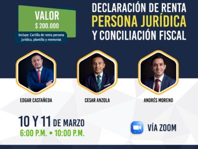 Declaración de renta persona jurídica y conciliación fiscal Conferencistas: Cesar Ánzola, Andres Moreno y Edgar Castañeda. Inversión: $ 200.000 Fecha: 10 y 11 de marzo del 2022 Temario: Acumulación y devengo para los ingresos, costos y gastos. Interés implícito en ingresos y costos, casos prácticos. Vidas útiles contables versus fiscales y depreciaciones. Deterioro de los activos, casos...