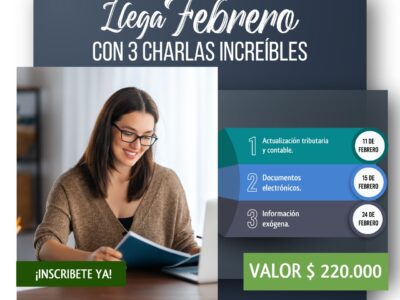 Capacitaciones febrero Llega febrero con 3 charlas increíbles Charlas: Actualización tributaria y contable Documentos electrónicos Información exógena Inversión: $ 220.000