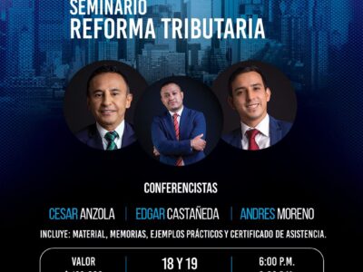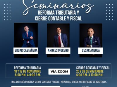 Seminarios Reforma Tributaria Cierre Contable y Fiscal Charlas: Reforma Tributaria Cierre Contable y Fiscal Conferencistas: Edgar Castañeda Cesar Anzola Andres Moreno Fecha: Reforma Tributaria 18 y 19 de Noviembre Cierre Contable y Fiscal 25 y 26 de noviembre Temario: Se revisarán en detalle los nuevos aspectos de la nueva reforma tramitada en el Congreso. Tenga en cuenta los aspectos mas relevantes para un...